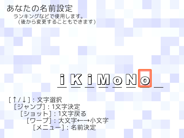 Gravityのときは個人識別はウインドウの色でしたが、今回はユーザー名使用可能にします。ランキングにももちろんこの名前が出てきます。