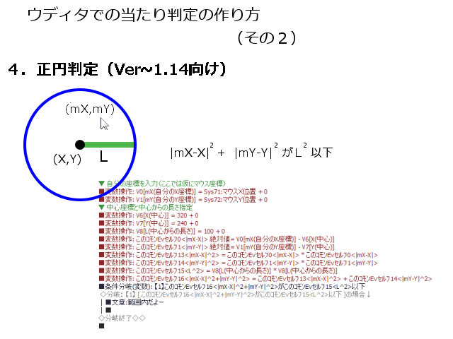 起きて確認したらまるで「今までのウディタでは円判定不可能だった」みたいな書き方だったので、別にそうではない事を追記。ただし、これはあくまで正円(真円)のみであって、