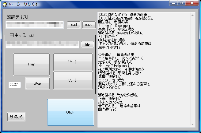 「txt,mp3を読み込む→再生する→クリックするとそのタイミングでタイムタグ追加→lrc保存」の一連の動作は実装しました。