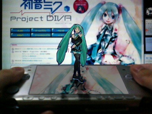 ミクだけじゃなく、他各所にもいくつか合成部分があったりします。PSP液晶ってココまで傾けるとコントラスト悪くなって見えなくなるんですよね。実際は。