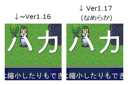 「320x240の時は普通にピクチャ表示するだけでなめらか処理対象」です。サンプルゲームのタイトル画像がすぐ分かる例ですが、320x240使う人はこれに気をつけてください。なめらか処理を行うと、ほんのちょっとぼやけた感じになりますから。